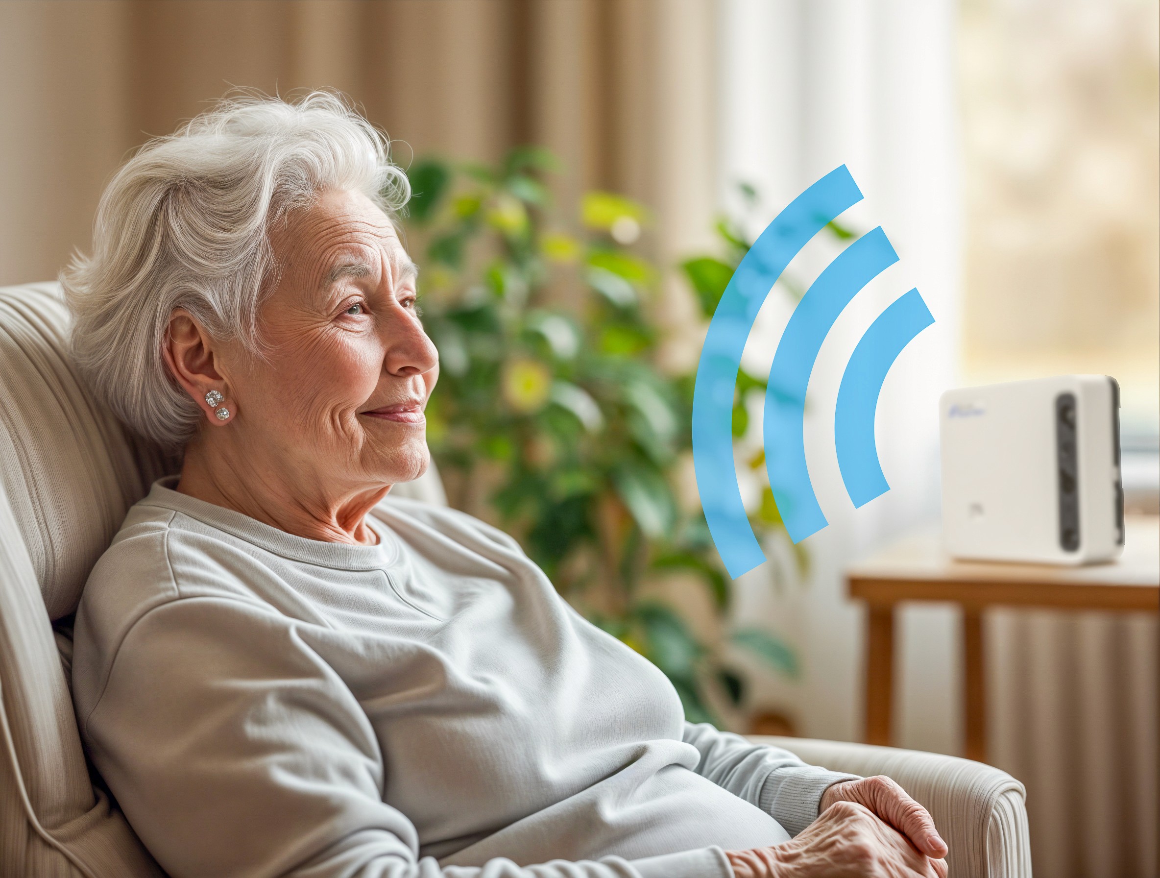 Doppler radar sensor monitors resident movement and activity without physical interaction or wearable devices.